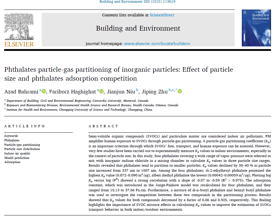 2025年8月,研究院以合作单位在Elsevier旗下期刊《Building and Environment》(中科院SCI一区Top期刊,2024年影响因子为8.35)上发表了题为“Phthalates particle-gas partitioning of inorganic particles: Effect of particle size and phthalates adsorption competition”的最新研究成果。研究院2025年引进特聘教授朱纪平博士为唯一通讯作者,重庆科技大学土木与水利工程学院为第三单位。