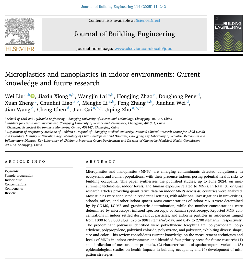 2025年8月,研究院在中科院SCI二区Top期刊《Journal of Building Engineering》上合作发表了题为“Microplastics and nanoplastics in indoor environments: Current knowledge and future research”的综述论文。研究院刘炜副教授为第一作者,蔡姣副教授和朱纪平教授为共同通讯作者,重庆科技大学为通讯单位。合作单位包括重庆医科大学附属儿童医院和重庆市生态环境监测中心。